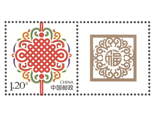 《中国结》代表着团结幸福平安,《中国结》个性化服务专用邮票带有空白附票用于邮票个性化服务业务,同时发行附票带有“福”字和吉祥图案的个性化服务专用邮票。