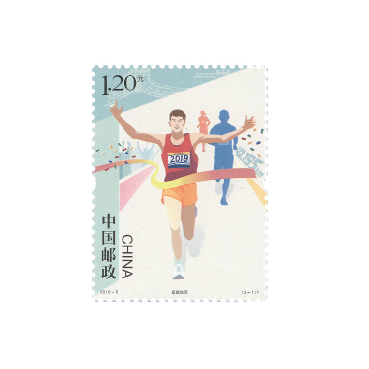 邮票第一图通过描绘马拉松运动员撞线的瞬间动态形象和背后欢呼的观赛人群,配合全程马拉松的里程数,突出了“挑战自我、超越极限、坚韧不拔、永不放弃”的马拉松精神。