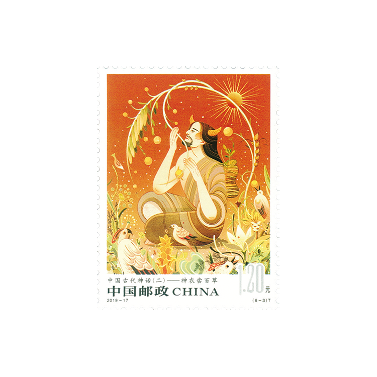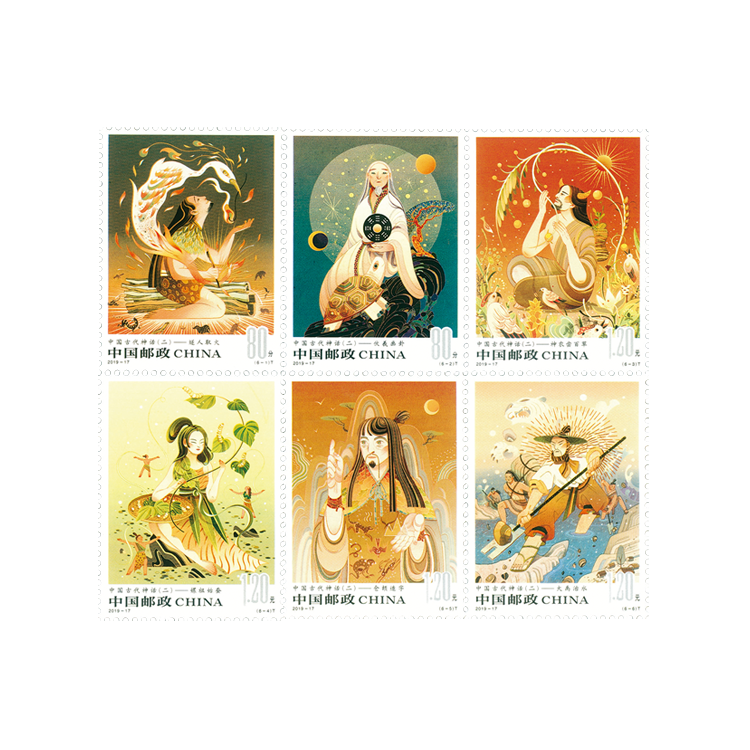 中国邮政定于2019年8月6日发行《中国古代神话(二)》特种邮票1套6枚,邮票图案名称分别为:燧人取火、伏羲画卦、神农尝百草、嫘祖始蚕、仓颉造字、大禹治水。全套邮票面值为6.40元。