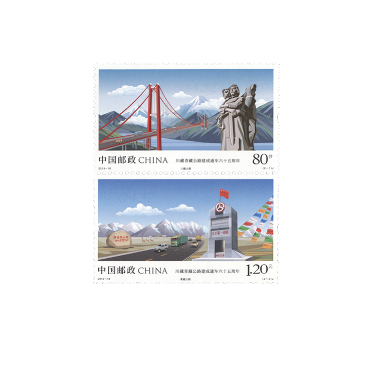 中国邮政定于2019年8月10日发行《川藏青藏公路建成通车六十五周年》纪念邮票1套2枚,全套邮票面值为2元。