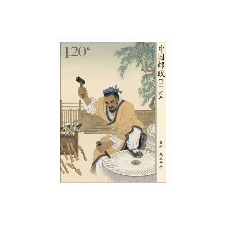 该套邮票采用工笔重彩的创作手法,画面构图饱满、敷色浓淡相宜、细节处理严谨细腻。第一图孜孜学艺,描绘了鲁班年轻时访得名师后,在山洞中专心研习的场景;第二图砥志研思,描绘了鲁班凿刻大石发明石磨的场景。小型张为鲁班像,描绘了鲁班手持墨斗,神情坚毅、目光炯炯,这是千万工匠不断钻研、追求极致的真实写照,也是“工匠精神”的生动体现。