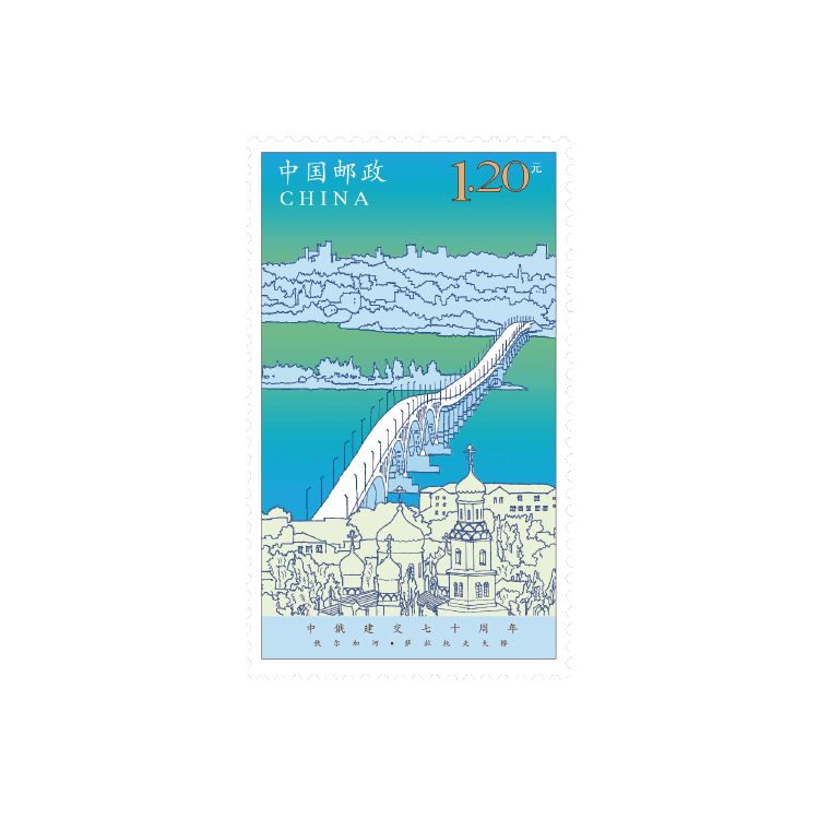 邮票由郭承辉设计,运用速写的表现手法,用笔洒脱、意境清新。横竖两种构图形式,分别描绘出横跨中国、俄罗斯母亲河的两座大桥与城市两岸的美丽风光,并通过色彩基调的变化,分别营造出两种风格、两个季节的独特氛围。