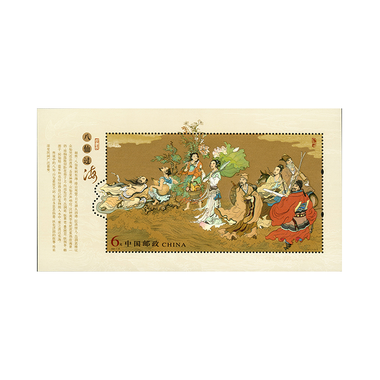 邮票原画由我国著名传统工笔画家、以“界画”称誉画坛的张孝友大师创作,设计者为王虎鸣先生。八仙为道教传说中八位神仙的合称,唐代即有记载,但至明代才确定了现在这组形象。在神话中这八位神仙道术极深,法力无边。八仙过海的故事最早见于明吴元泰所著《上洞八仙传》:一次外出赴会,见波涛汹涌,在吕洞宾的提议下众仙各施道法过海,汉钟离用芭蕉扇,铁拐李用装仙丹的大葫芦,吕洞宾用其宝剑,张果老倒骑着一匹纸驴,蓝采和提着花篮,韩湘子举着玉笛,曹国舅执枟板,何仙姑擎荷花,——逐浪而渡。以此“八仙过海,各显神通”便成为家喻户晓的故事。