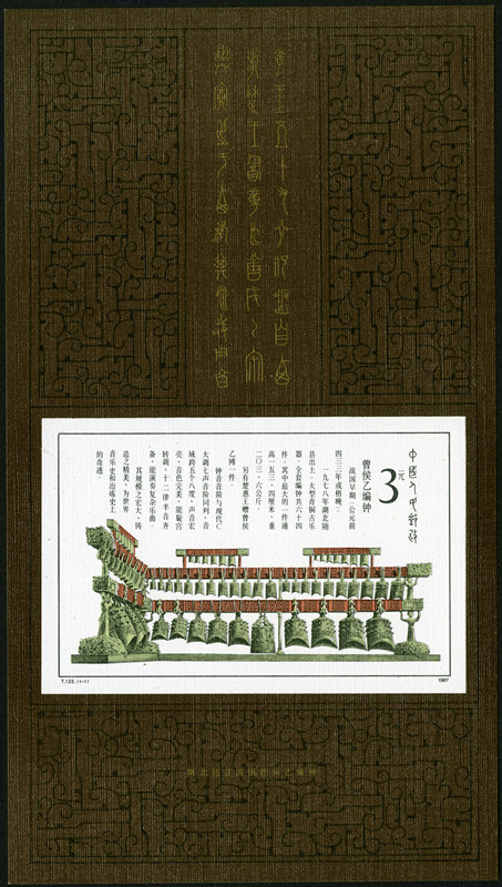 本套邮票于1987年12月10号发行,面值3元,票面图案为曾侯乙编钟,发行量达到396.45万枚。