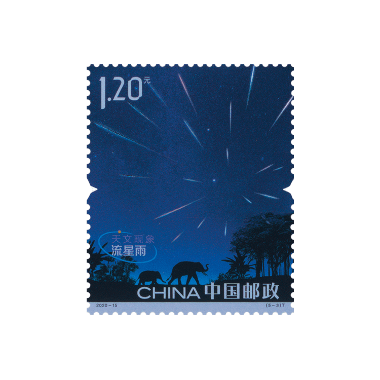 星际空间的微细尘埃以高速闯进大气层,与大气分子磨擦生热而产生白炽光形成流星,流星划过天空会出现的一条短暂的亮带。邮票第三枚“流星雨”以对冲的角度再现绚丽的流星雨场面。