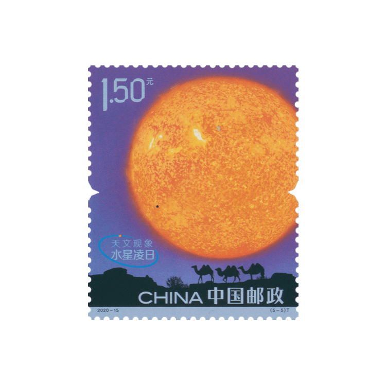 水星运行至地球和太阳之间,三者连成直线,太阳投射的光线被水星挡住。从地球观测,太阳上形成一个小黑点,即为“水星凌日”现象。邮票第五枚“水星凌日”以望远镜的视角观测水星黑影,再现水星掠过太阳的过程。