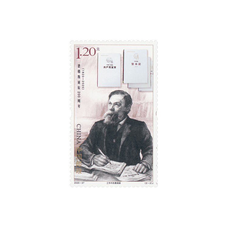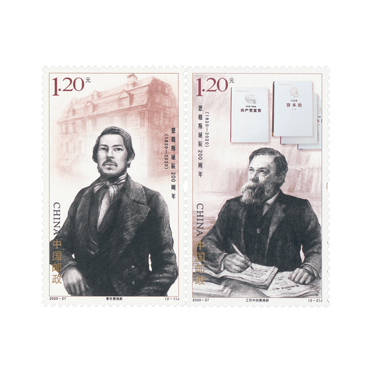 中国邮政定于2020年11月28日发行《恩格斯诞辰200周年》纪念邮票一套2枚。邮票图案名称分别为:青年恩格斯、工作中的恩格斯。全套邮票面值为2.40元。计划发行数量为750万套。