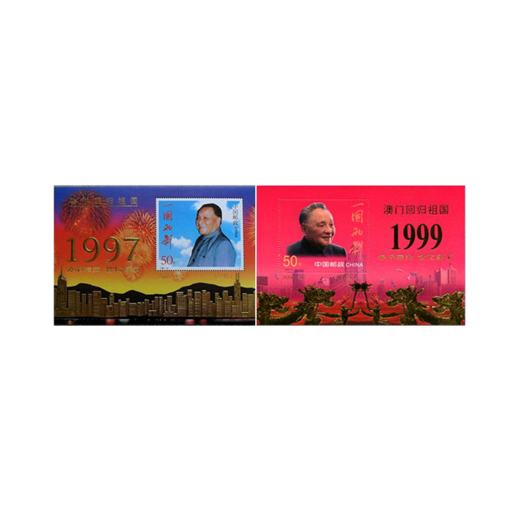 2000年1月1日,为纪念港、澳回归,并预祝祖国统一大业早日完成和迎接新世纪,国家邮政局特别发行了《港澳回归 世纪盛事(金箔小型张)》纪念邮票,全套2枚。