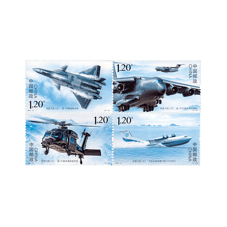 中国邮政定于2021年4月17日发行《中国飞机(三)》特种邮票一套4枚,全套邮票面值为4.80元,邮票计划发行数量800万套,版式二计划发行数量105万版,另发行本票册一本,售价50元,计划发行数量10万本。