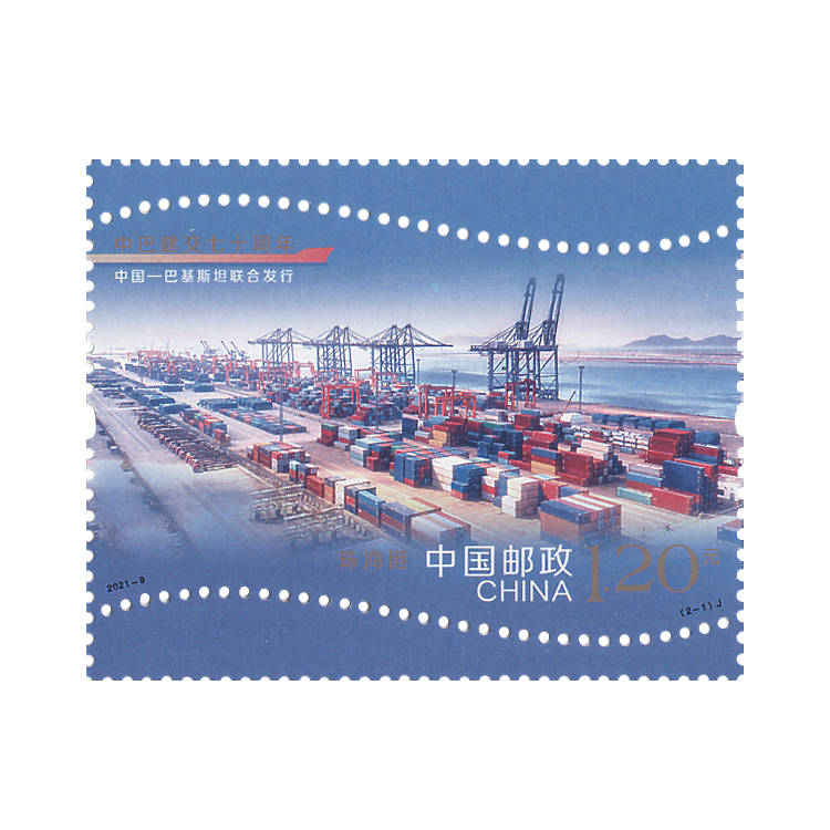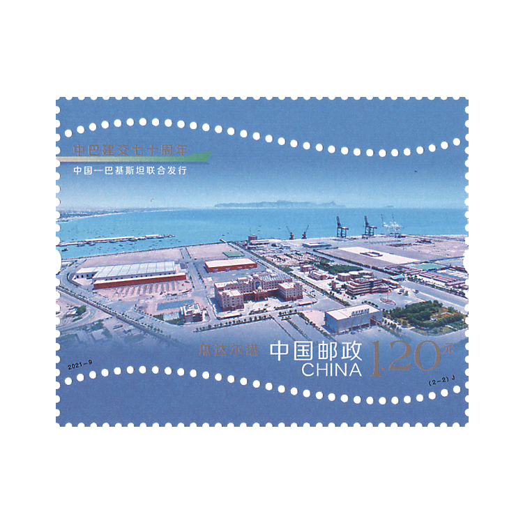 2021年是中华人民共和国与巴基斯坦伊斯兰共和国建交70周年,为增进中巴两国人民之间的相互了解和友谊,中国邮政定于2021年5月21日发行《中巴建交七十周年》纪念邮票一套2枚(与巴基斯坦联合发行),邮票图案名称分别为:珠海港、瓜达尔港,全套邮票面值为2.40元,邮票计划发行数量710万套。