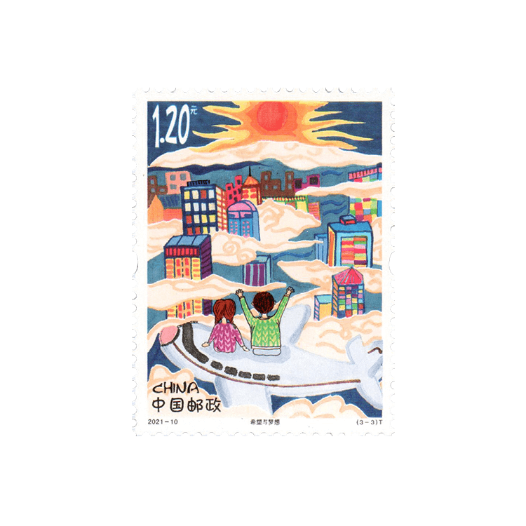 该套邮票的表现内容为:(1)我的中国梦;(2)国粹之韵;(3)希望与梦想。第一枚通过描绘我国航空航天事业、城市、交通网络繁荣发展等场景,表达了少年儿童不断追寻对宇宙探索的梦想以及对未来美好生活的想象与憧憬;第二枚描绘了传统文化与城市发展、现代科技共繁荣的场景,表达了新时代的少年儿童对中华优秀传统文化的追求和传承;第三枚描绘了伟大祖国不断发展的场景,少年儿童登高望远、憧憬未来。三枚邮票紧密围绕主题,展现出少年儿童对党的领导下伟大祖国的美好祝愿、热爱和自豪。
