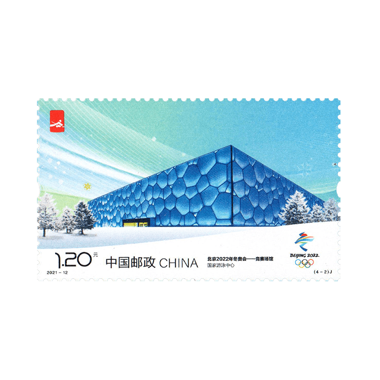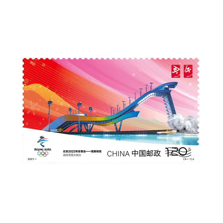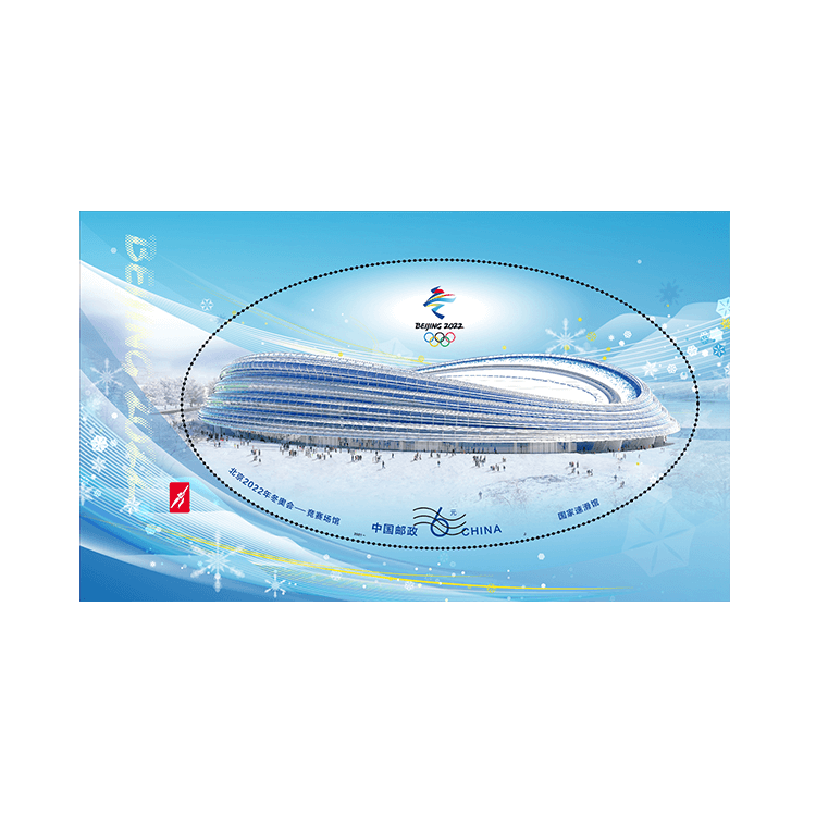 《北京2022年冬奥会——竞赛场馆》纪念邮票内容包括首钢大跳台、国家游泳中心、国家跳台滑雪中心、国家雪车雪橇中心,小型张为国家速滑馆。该套邮票采用平面设计手法表现,画面构图饱满、色彩丰富,4枚邮票采用连票设计形式,以富有变化的曲线贯穿;小型张邮票则根据场馆的结构特点,采用椭圆形票幅展现,并在边饰中点缀雪花图形。同时该套邮票上的北京2022年冬奥会会徽和体育图标,使票面更具节奏感和韵律感。