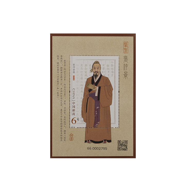 邮票第1枚“坐堂行医”,画面表现了张仲景任长沙太守时,开放公堂为百姓治病的场景。邮票第2枚“撰书立著”,画面表现了张仲景编撰《伤寒杂病论》、著书研医的生动场景,背景运用《白云阁藏本<伤寒杂病论>序》,突出主题。小型张“张仲景像”,人物线条挺劲流畅、形象刻画生动,塑造了张仲景施仁术、济苍生的大医气度。画面背景衬以小柴胡汤方原文,凸显博大精深的中医药文化。