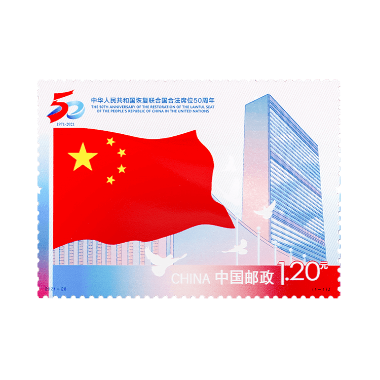 中国邮政定于2021年10月25日发行《中华人民共和国恢复联合国合法席位50周年》纪念邮票一套1枚,全套邮票面值1.20元。