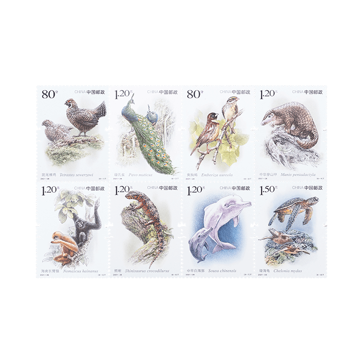 中国邮政定于2021年12月3日发行《国家重点保护野生动物(I级)(三)》特种邮票一套8枚。邮票图案名称分别为:斑尾榛鸡、黄胸鹀、绿孔雀、中华穿山甲、海南长臂猿、鳄蜥、中华白海豚、绿海龟。全套邮票面值9.10元。邮票计划发行数量为620万套。这是继2000年、2001年后发行的“国家重点保护野生动物(I级)”系列邮票的第三组。