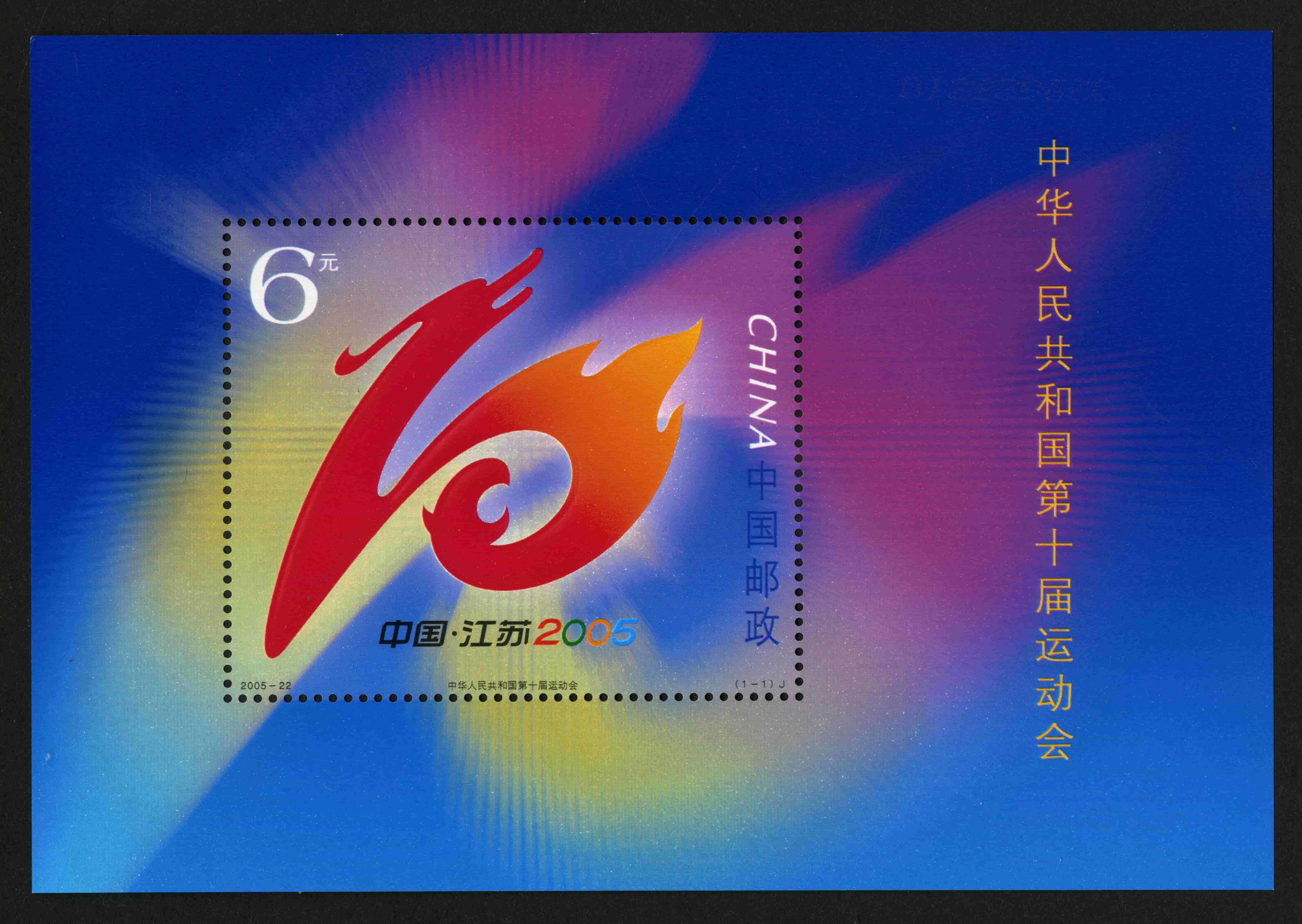 《中华人民共和国第十届运动会》小型张由国家邮政局发行于2005年10月12日,面值为6元,820万枚的发行量。这版小型张的规格为60×50毫米,齿孔度数为12.5×12度,采用影写版印(采用压凸印制工艺)以及防伪纸张、防伪油墨、荧光喷码三种防伪方式,由中国邮票设计大家沈嘉宏担纲设计,北京邮票厂印制而成。第十届全运会于2005年10月12日在中国江苏举行,共设了32个体育竞赛项目,反响热烈,这版小型张了的发行便是为了纪念中华人民共和国第十届运动会的顺利召开。它的图案设计非常有特色,主体图案由10变化而来,但远而观之又像是“苏”字,生动形象地照应了主题。