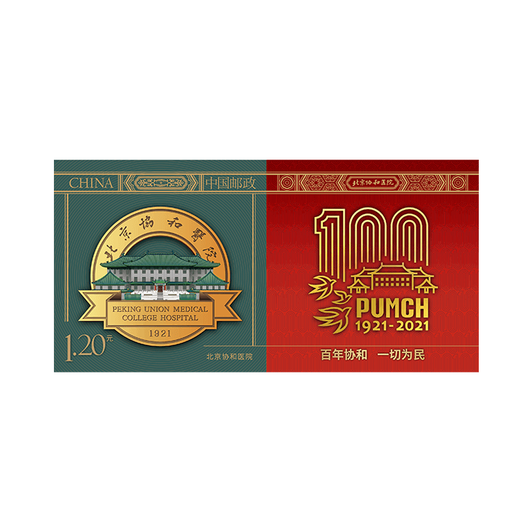《北京协和医院》个性化服务专用邮票,特邀清华美术学院陈楠教授团队设计,主票画面将北京协和医院院徽与代表性建筑群加以结合,采用艺术插画方式表现,画面背景采用院徽标准色,向四周扩展的层层金线象征北京协和医院医学理念、文化精神的广泛传播。同时将协和医院传统建筑的斗拱图案巧妙与邮票构图相结合,画面主题突出、视觉特色鲜明、构思精巧。附票画面以北京协和医院百年院庆标志及协和理念为主体,画面背景采用具有光影效果的红色表现,同主票相互辉映。