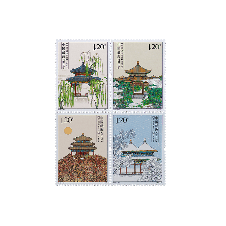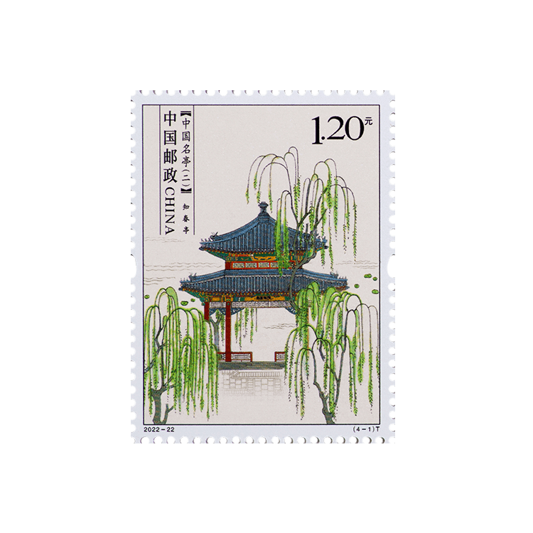 中国邮政定于2022年10月3日发行《中国名亭(二)》特种邮票1套4枚。邮票图案名称分别为:知春亭、水流云在亭、万春亭、双环亭。全套邮票面值为4.80元。