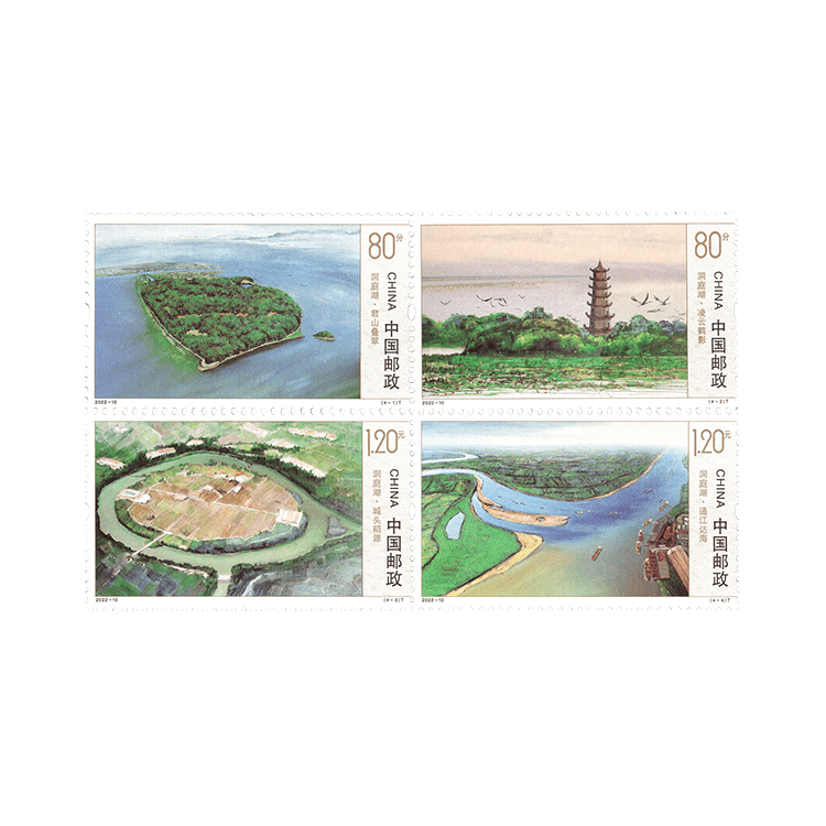 中国邮政定于2022年5月28日发行《洞庭湖》特种邮票一套4枚,小型张1枚。邮票图案名称分别为:君山叠翠、凌云鹤影、城头稻源、通江达海,小型张图案名称为:洞庭天下水。全套邮票面值为10元。邮票计划发行数量为660万套,小型张计划发行数量为590万枚。