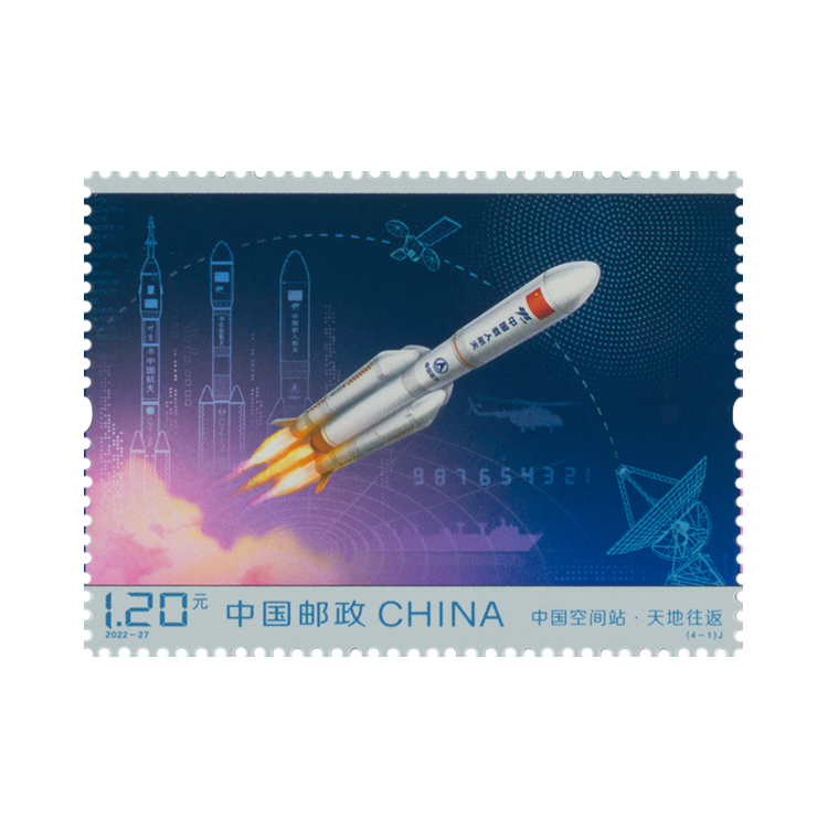 第1枚 天地往返。画面以腾飞的长征五号B运载火箭为前景,背景展现了中国空间站建造过程中发射载人飞船、货运飞船、核心舱等舱段使用的三型火箭,以及测控船、测控雷达、测控卫星返回舱等丰富内容。