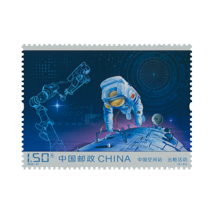 中国邮政定于2022年12月25日发行《中国空间站》纪念邮票一套4枚。邮票表现内容为:(1)天地往返;(2)空间科学;(3)出舱活动;(4)太空家园。全套邮票面值5.40元。邮票计划发行数量为套票800万套,版式二110万版。