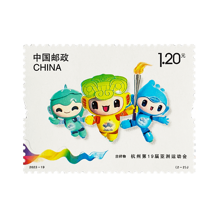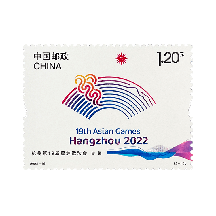 中国邮政定于2023年9月23日发行《杭州第19届亚洲运动会》纪念邮票一套2枚,邮票图案名称为会徽、吉祥物。全套邮票面值2.40元。邮票计划发行数量为783万套,版式二 88.5 万版。