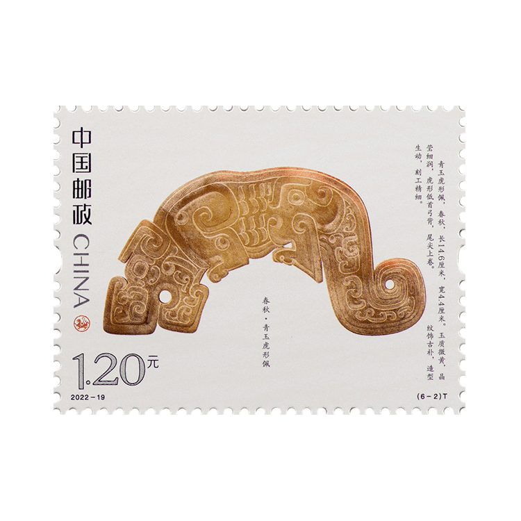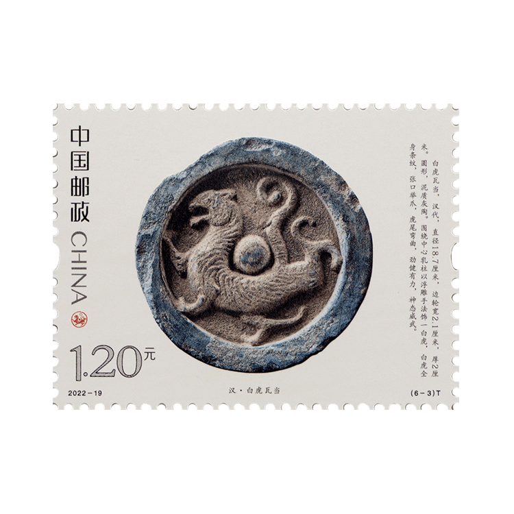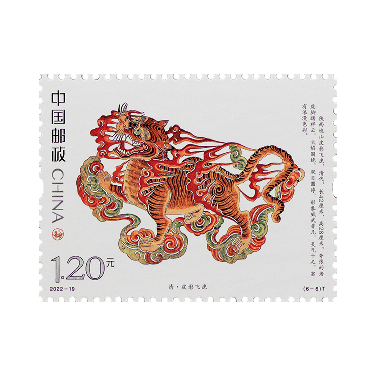 中国邮政定于2022年9月5日发行《虎(文物)》特种邮票一套6枚。邮票图案名称分别为:商·伏鸟双尾青铜虎、春秋·青玉虎形佩、汉·白虎瓦当、汉·错金铭文铜虎节、金·磁州窑白釉褐花卧虎枕、清·皮影飞虎。全套邮票面值为7.20元。