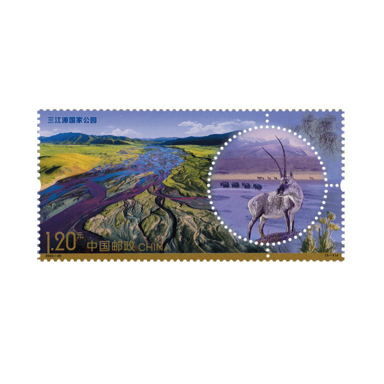 三江源国家公园总面积19.07万平方公里,位于青海省西南部,划分为长江源、黄河源、澜沧江源3个园区。园内山脉逶迤纵横,冰川耸立,是高寒生态系统典型代表和高寒生物种质资源库。美丽而神秘的三江源,雪原广袤,河流、沼泽与湖泊众多,素有“中华水塔”之称。长江、黄河、澜沧江三大江河起源于同一区域的地理奇观,在这里向世人惊艳呈现。邮票表现了藏羚羊、野牦牛、藏野驴、水母雪莲、红花绿绒蒿等元素。