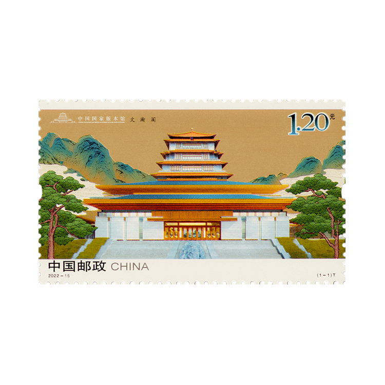 该套邮票由史渊设计,画面采用中轴对称构图形式,以国家版本馆中央总馆核心建筑——文瀚阁为主体内容,采用青绿山水画视觉元素,使画面呈现中国画样式的传统韵味,充分彰显了国家版本馆深厚的文化积淀,极具传统审美特点。版式一邮票过桥位置展现了国家版本馆西安分馆——文济阁、杭州分馆——文润阁、广州分馆——文沁阁的外观风貌,体现“一总三分”的总体布局。