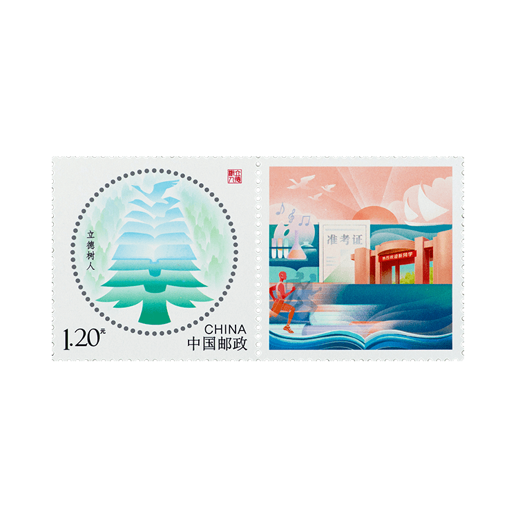 该套邮票由陈楠设计。陈楠,清华大学美术学院教授、博士生导师,曾设计《孔子学院》《中国红十字会成立一百周年》《长江三峡工程·发电》等纪特邮票以及《清华大学》《北京协和医院》个性化服务专用邮票。邮票主图以打开的书本组成树木造型,体现“立德树人”主题,色彩蓝绿交织、清新靓丽;附图将海浪、飞鸟、旭日、帆船等图形元素与书本、准考证、校门等元素符号相结合进行概念化设计,寓意一代代青少年志存高远、勤学求知、砥砺品格、接续奋斗,在拼搏和奉献中实现人生价值,努力在实现中华民族伟大复兴中国梦的生动实践中放飞青春梦想。