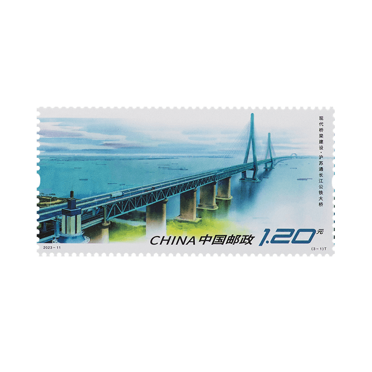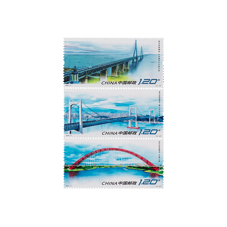 中国邮政定于2023年6月30日发行《现代桥梁建设》特种邮票1套3枚、小型张1枚,邮票图案名称为沪苏通长江公铁大桥、瓯江北口大桥、平南三桥,小型张图案名称为北盘江第一桥。全套邮票面值9.60元。邮票计划发行数量为735万套,小型张计划发行数量585万枚。