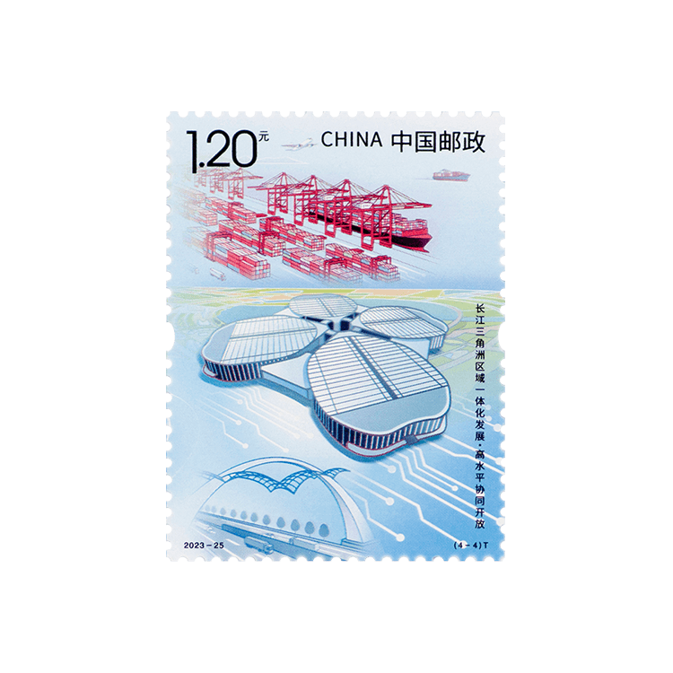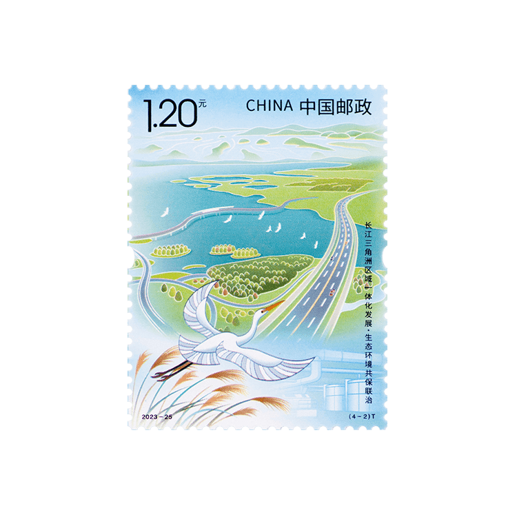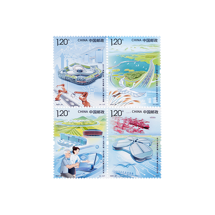 中国邮政定于2023年12月1日发行《长江三角洲区域一体化发展》特种邮票一套4枚,邮票图案名称分别为科创产业融合发展、生态环境共保联治、公共服务便利共享、高水平协同开放。全套邮票面值4.80元。
