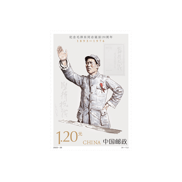 中国邮政定于2023年12月26日发行《纪念毛泽东同志诞辰130周年》纪念邮票1套4枚,邮票图案名称分别为坚持抗战、建设十三陵水库、胸怀天下、重上井冈山。全套邮票面值4.80元。邮票计划发行数量为780万套,版式二计划发行量为98万版。