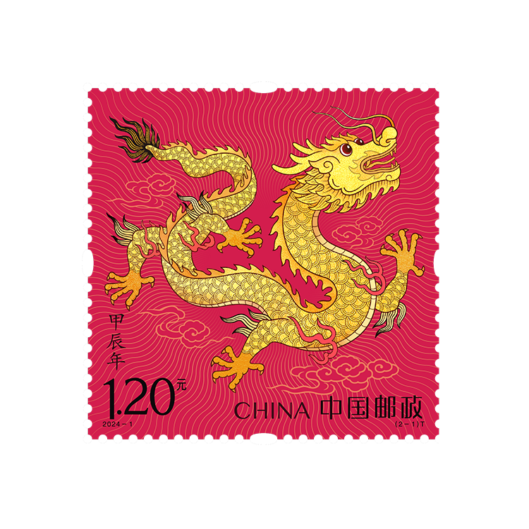 在十二生肖中,龙是神兽,象征尊贵和力量,在民间寓意吉祥好运。邮票一套两枚,图案汲取中国历代经典龙形象中的文化基因,结合生肖文化特征和邮票艺术特点,用平面装饰的设计语言诠释出新的时代、新的历史时期的龙形象,彰显出新时代自信、自强的文化底蕴,画面简洁明快,色彩喜庆吉祥,寓意祥瑞美好。邮票一图名为“天龙行健”,展现了一条昂首奋发的金龙,象征蓬勃向上、自强不息的精神风貌。其形象和姿态源自故宫九龙壁,灵动宛转而不失敦厚威严。金龙身旁饰以寓意吉祥的火焰和祥云纹样并衬以中国红背景,展现出吉庆祥和、纳福迎祥的美好图景;二图名为“辰龙献瑞”,邮票图案源于中国传统吉祥纹样“祥龙拱璧”。画面整体与邮票外形构成“天圆地方”的格局,和谐而庄重。中央玉璧有“祥瑞”二字合文,寓意祥和圆满、福瑞安康。上方的如意纹样传递出和顺致祥之意,下方的水纹、云纹与龙形象共同展现了龙腾四海的宏阔景象,表达出风调雨顺、国泰民安的美好愿望。两枚邮票主打红、金、黑经典三色,体现出了大气、贵气、瑞气和喜气,一动一静、相得益彰。该套邮票由王虎鸣设计,北京邮票厂有限公司采用胶雕套印工艺印制。