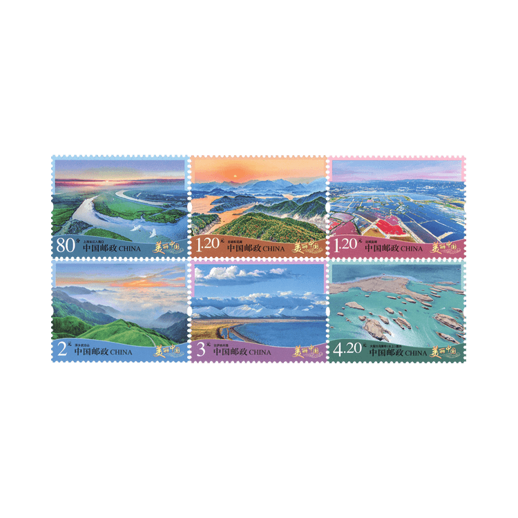 中国邮政定于2024年9月5日发行《美丽中国》(四)普通邮票6枚,邮票图案名称为上海长江入海口、吉林松花湖、运城盐湖、萍乡武功山、拉萨纳木措、大柴旦乌素特(水上)雅丹。