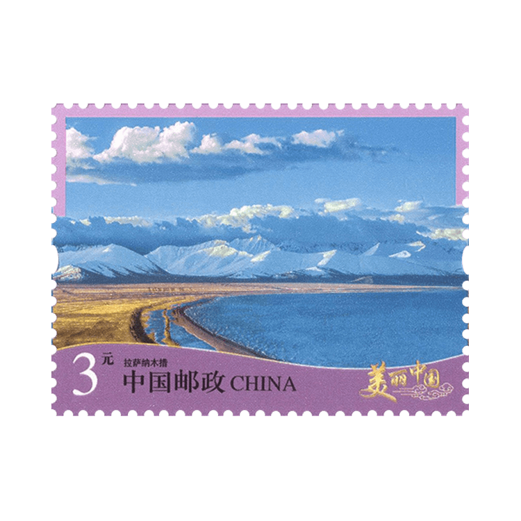 第五枚“拉萨纳木措”,纳木措,藏语意为“天湖”,在西藏自治区拉萨市以北当雄、班戈两县间,念青唐古拉山北麓。纳木措面积约1940平方千米,湖面海拔4718米,是西藏自治区第二大的湖泊,中国第三大咸水湖,也是世界上海拔最高的大湖。湖滨平原绕湖四周,每到夏初时节,成群的野鸭飞来栖息,繁殖后代。湖泊周围常有狗熊、野牦牛、野驴、岩羊、狐狸、獐子、旱獭等野生动物栖居,湖中盛产高原的细鳞鱼和无鳞鱼类,湖区还产虫草、贝母、雪莲等名贵药材。