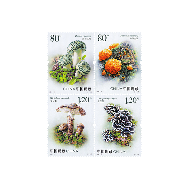 中国邮政定于2025年7月12日发行《食用菌(二)》特种邮票1套4枚,邮票图案名称为:变绿红菇、中华金耳、松口蘑、干巴菌。 全套邮票面值4.00元,计划发行数量490万套。