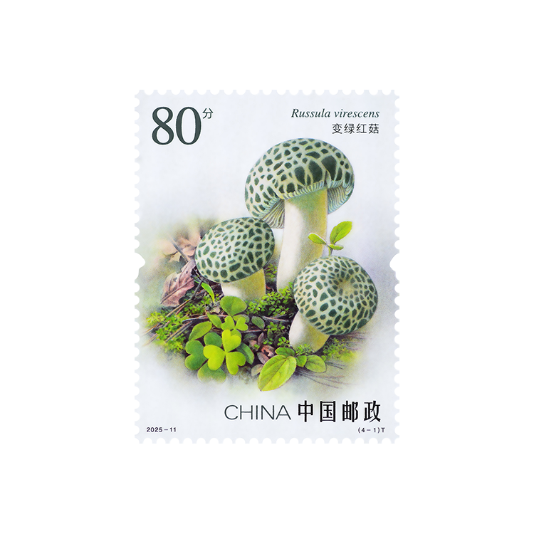 第一枚“变绿红菇”,俗称“青头菌”,隶属红菇科。菌盖较硬,呈青绿色,表面有青褐色的鳞片。其分布广泛,鲜美的口感深受人们喜爱。邮票设计突出其青翠欲滴的色泽,并融入森林生态背景,使整体形象兼具自然野趣与美学韵味。