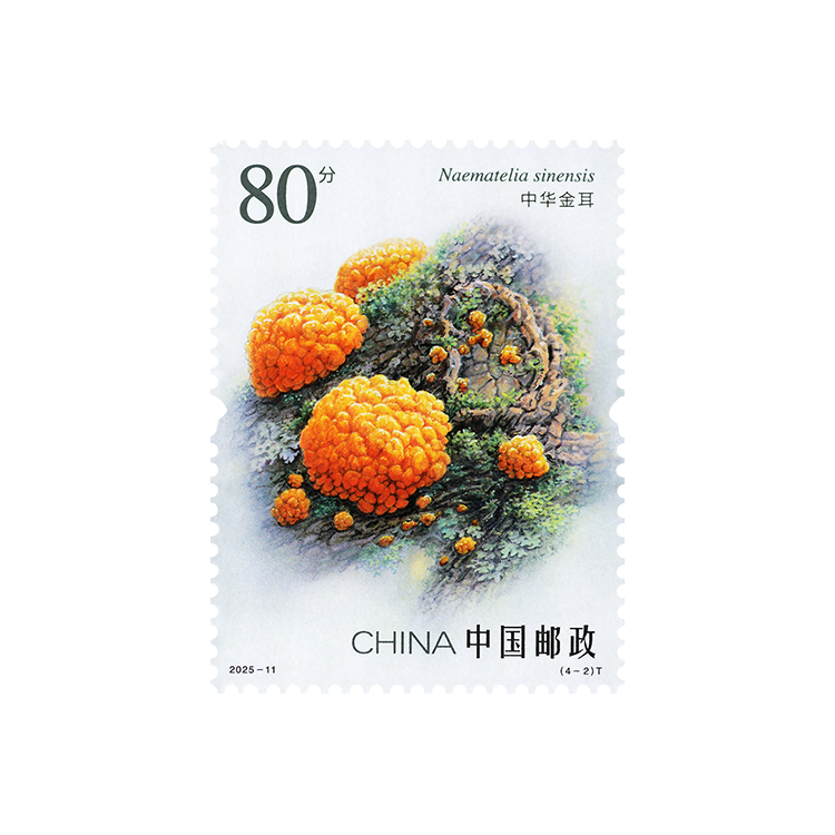 第二枚“中华金耳”,简称“金耳”,隶属白耳科。其外观呈金黄色,质地柔韧富有弹性,兼具食用与药用价值。2024年,我国科研人员利用生命条形码技术,首次明确市场上常见的“金耳”为新种——中华金耳,进一步揭示了其生物学特性。邮票采用独特的博物画风格精准还原金耳独特的皱纹与柔韧的果冻状质地。