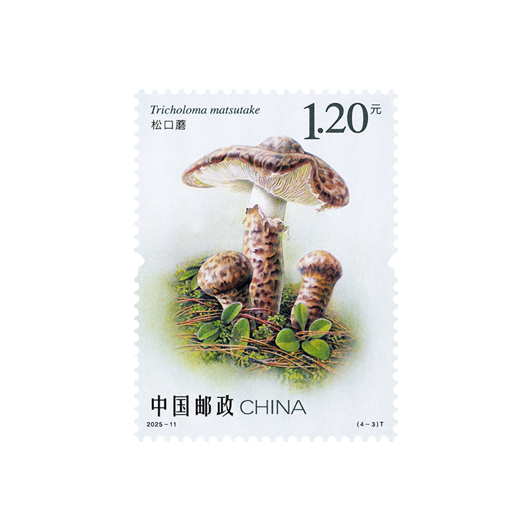 第三枚“松口蘑”,俗称“松茸”,隶属口蘑科,是世界公认的珍稀名贵天然食用菌,同时也是我国二级濒危保护物种。松口蘑历来被誉为食用菌中的瑰宝,享有“蘑菇之王”的美誉,珍贵无比。邮票采用细致的笔法刻画松口蘑菌盖表面的细微纹理及菌柄的粗壮形态,同时背景加入松林元素,以柔和的光影表现其生长环境,增强画面的自然氛围。