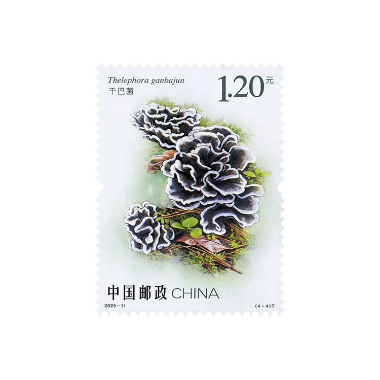 第四枚“干巴菌”,又称“干巴革菌”,隶属革菌科,为中国特有种。其丛生状如珊瑚,枝杈交错,色泽介于灰白与灰黑之间。邮票以精细入微的线条勾勒干巴菌丛生分枝的复杂结构,辅以简洁柔和的背景突出主体,再现了其鲜活之态。