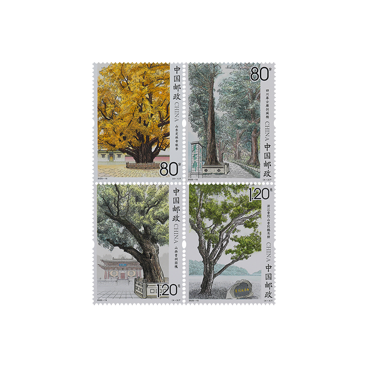 中国邮政定于2025年8月15日发行《古树名木》特种邮票1套4枚,邮票图案名称为:山东定林寺银杏、四川翠云廊剑阁柏、山西晋祠国槐、浙江普陀山普陀鹅耳枥。全套邮票面值4.00元,计划发行数量为470万套。