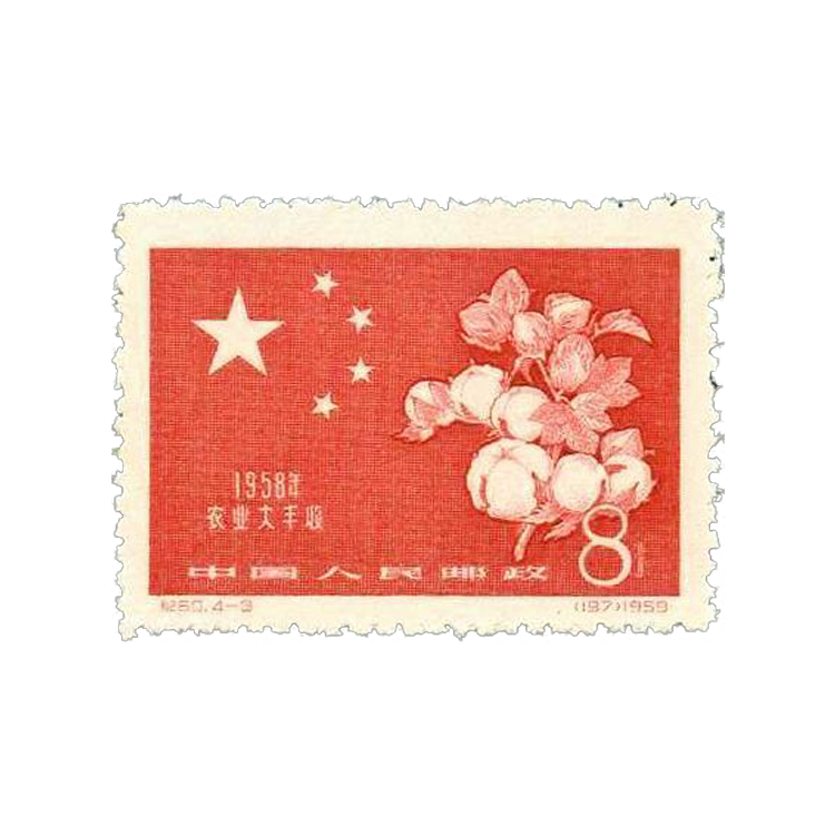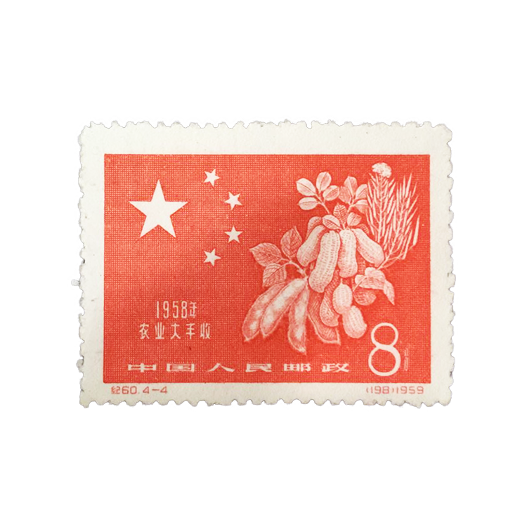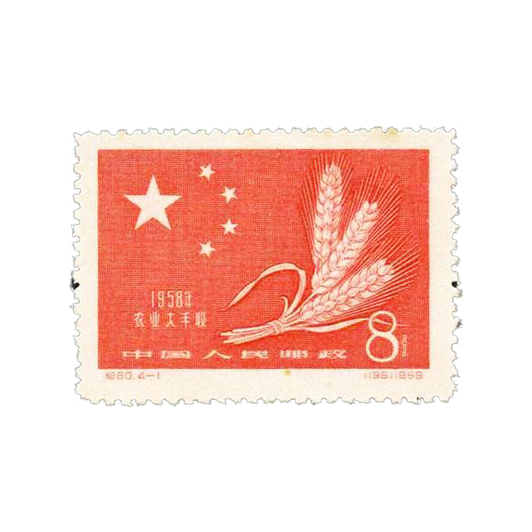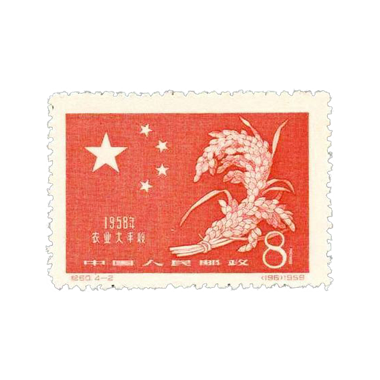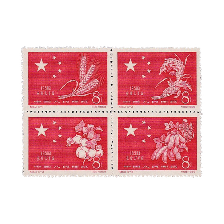 1959年4月25日,为了反映1958年“大跃进”时代的农业生产情况,邮电部发行了《一九五八年农业大丰收》纪念邮票,全套4枚。