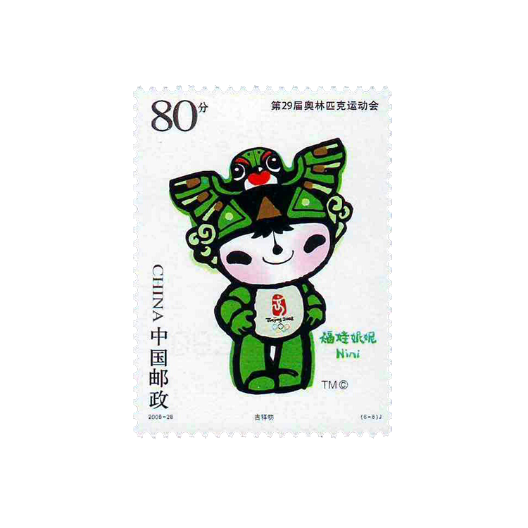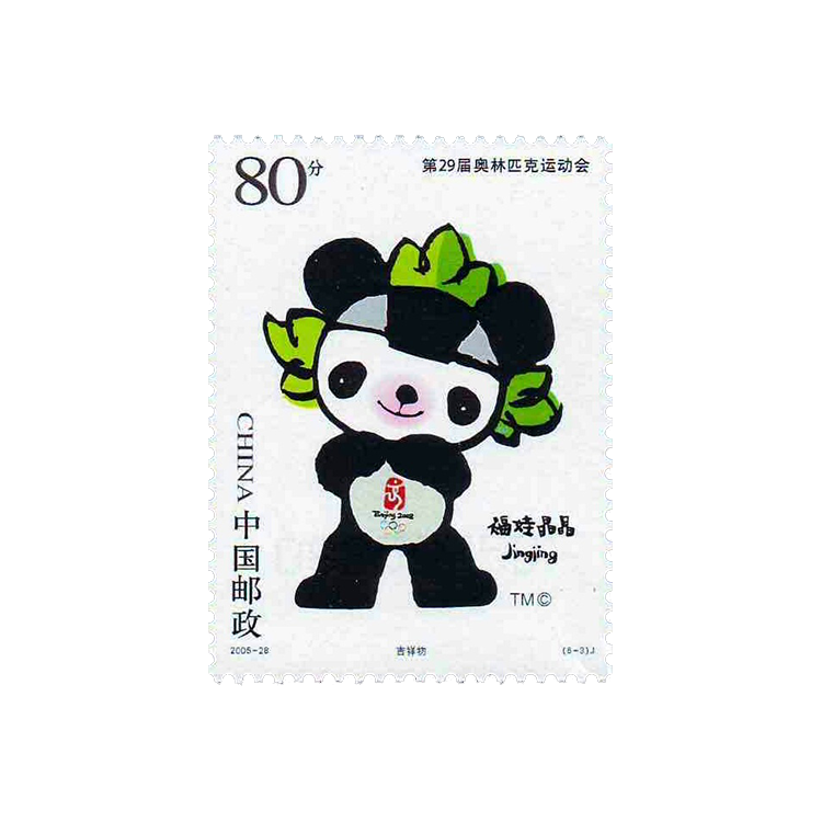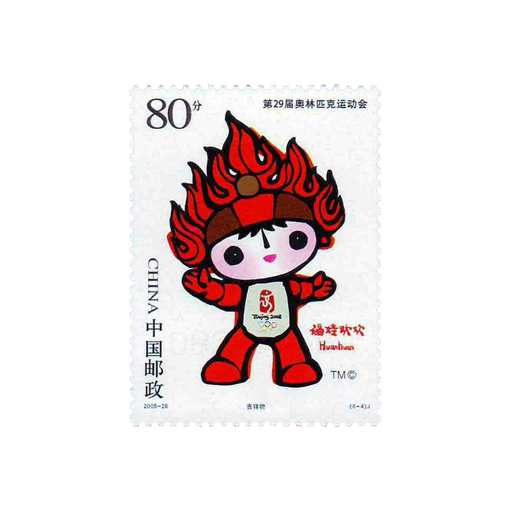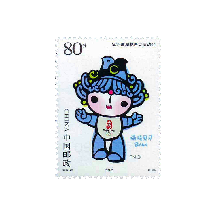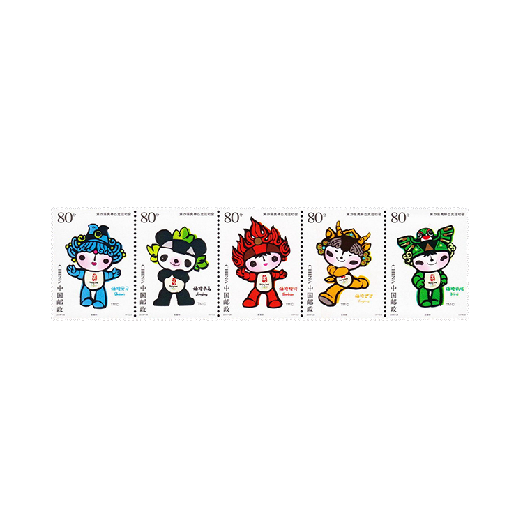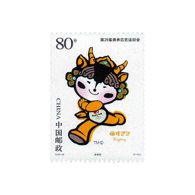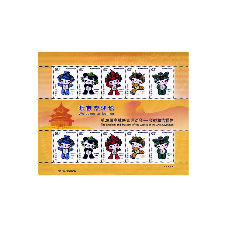 2005年11月12日,为纪念第29届夏季奥林匹克运动会即将在我国举行,国家邮政局发行了《第29届奥林匹克运动会-会徽和吉祥物》纪念邮票,全套6枚,同时发行不干胶版张(版式二)1套1版。