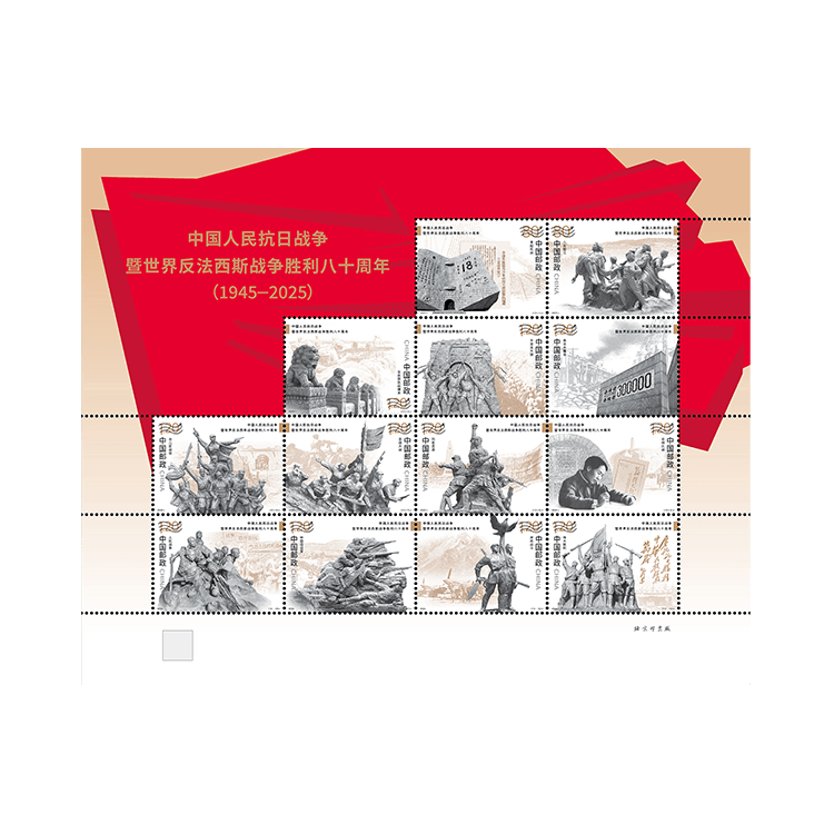根据党中央有关中国人民抗日战争暨世界反法西斯战争胜利80周年纪念活动安排,中国邮政于2025年9月3日发行《中国人民抗日战争暨世界反法西斯战争胜利八十周年》纪念邮票1套13枚、小型张1枚,全套面值为20.8元。邮票计划发行数量为600万套、小型张为500万枚。