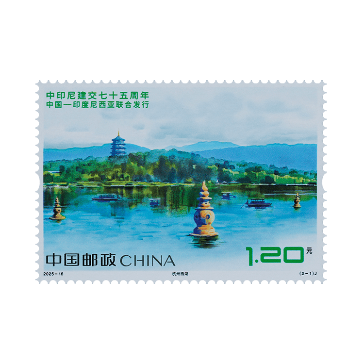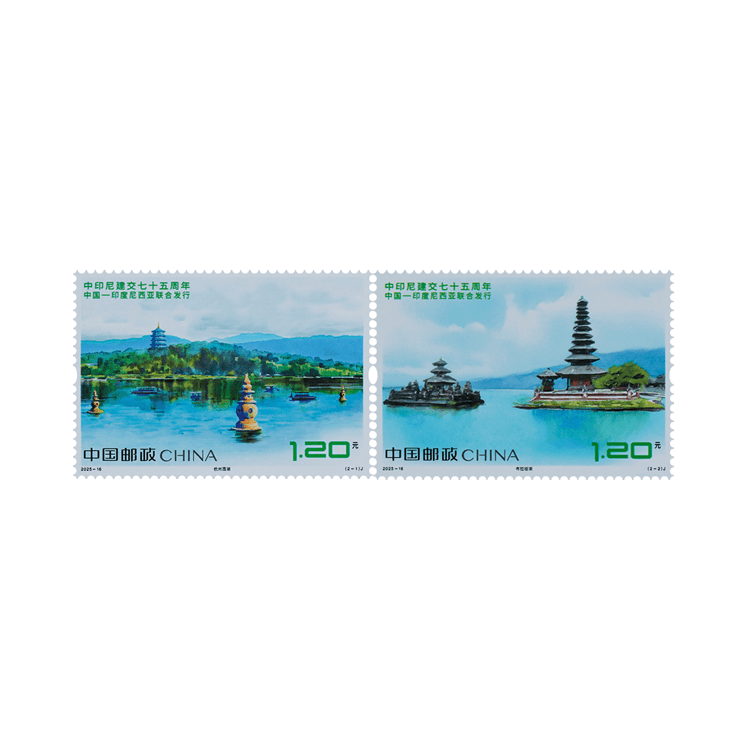 中国邮政定于2025年8月30日发行《中印尼建交七十五周年》(与印度尼西亚联合发行)纪念邮票1套2枚,邮票图案名称为:杭州西湖、布拉坦湖。全套邮票面值2.40元,计划发行数量450万套。