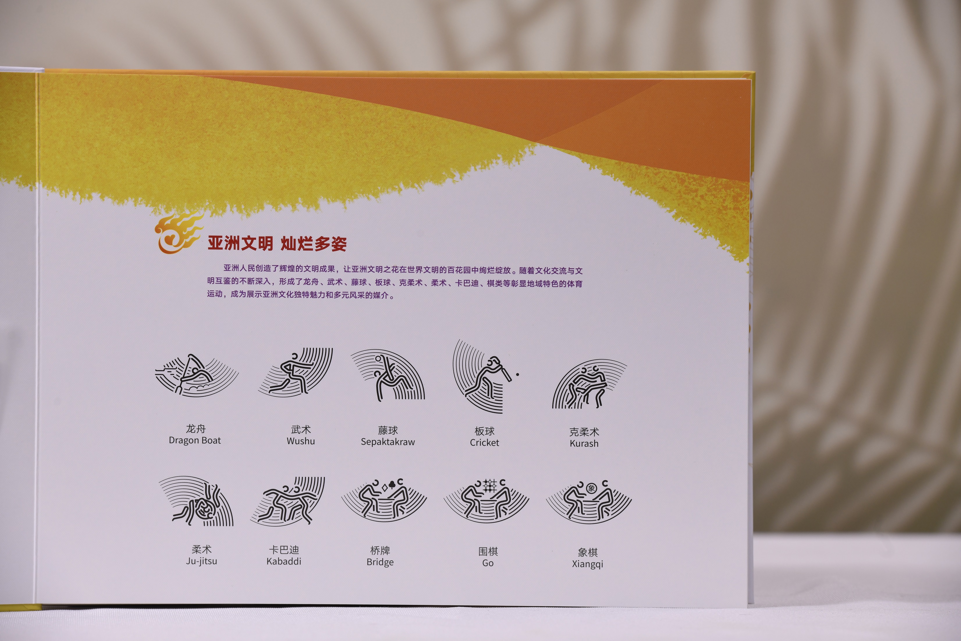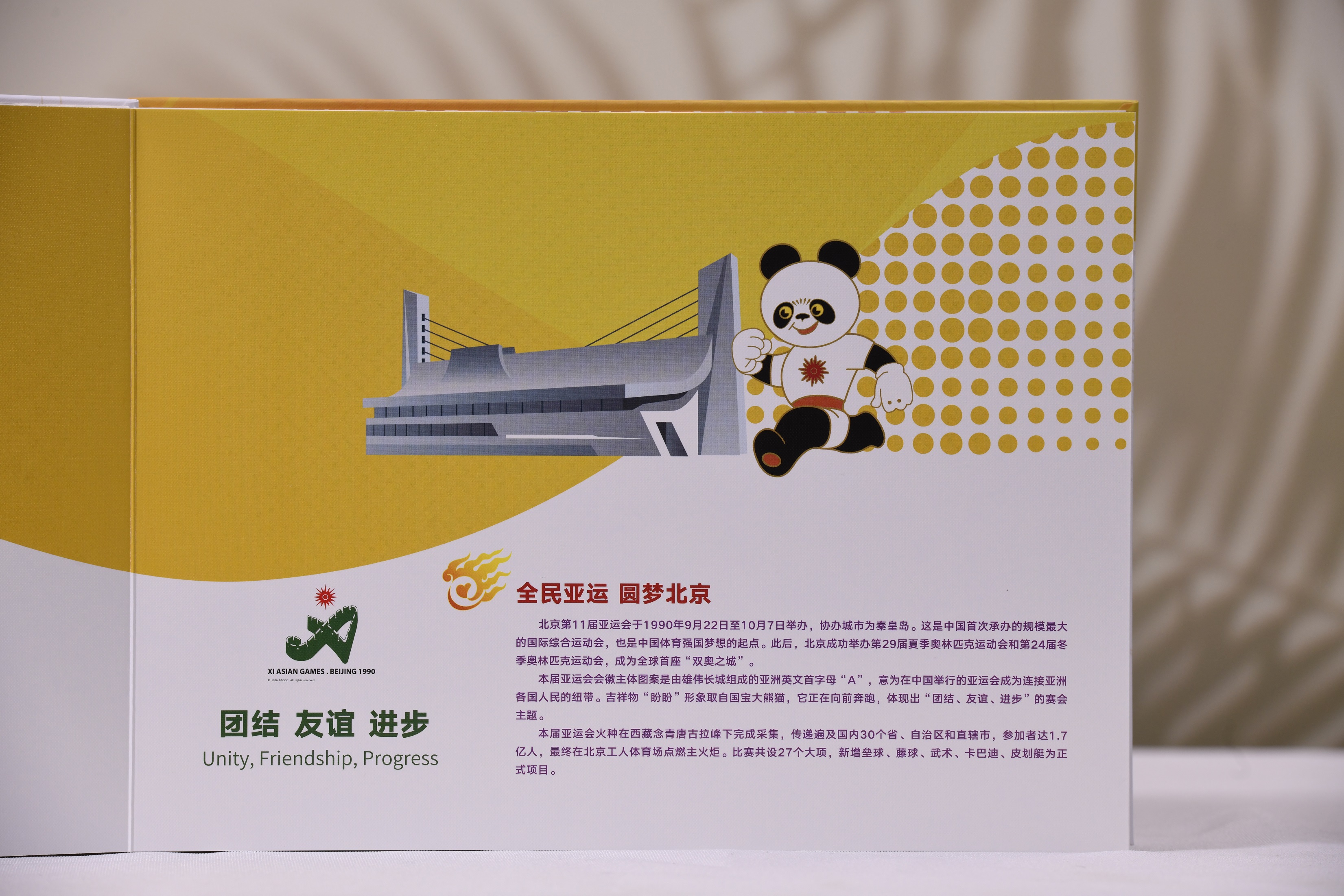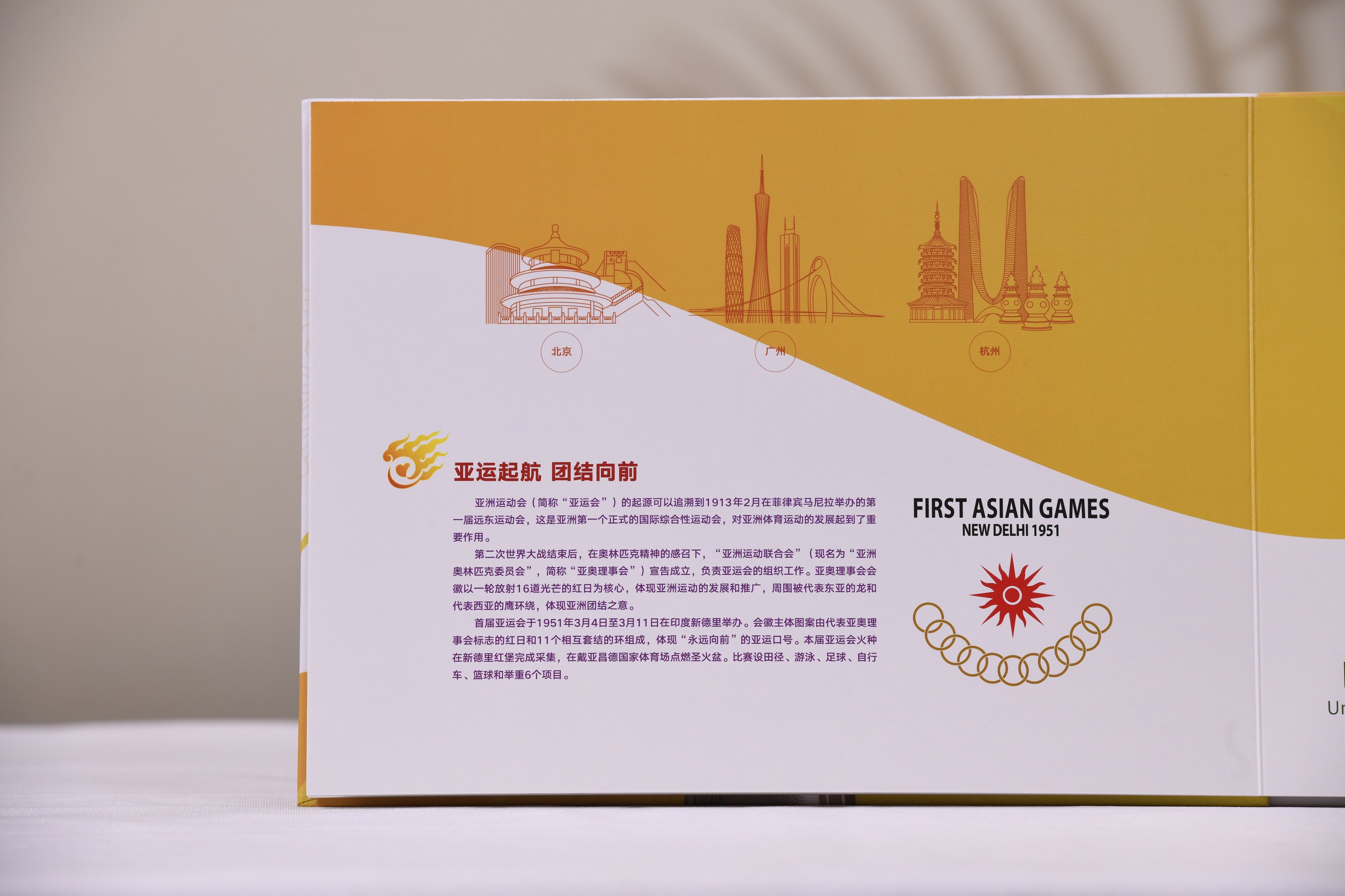 邮折一侧以“多彩亚洲 薪火相传”为主线,追溯亚洲文明和中华文明的历史长河,反映亚运会体育竞技和文化交流的时代特征,讲述亚洲、亚运和中国历次举办亚运会的故事。