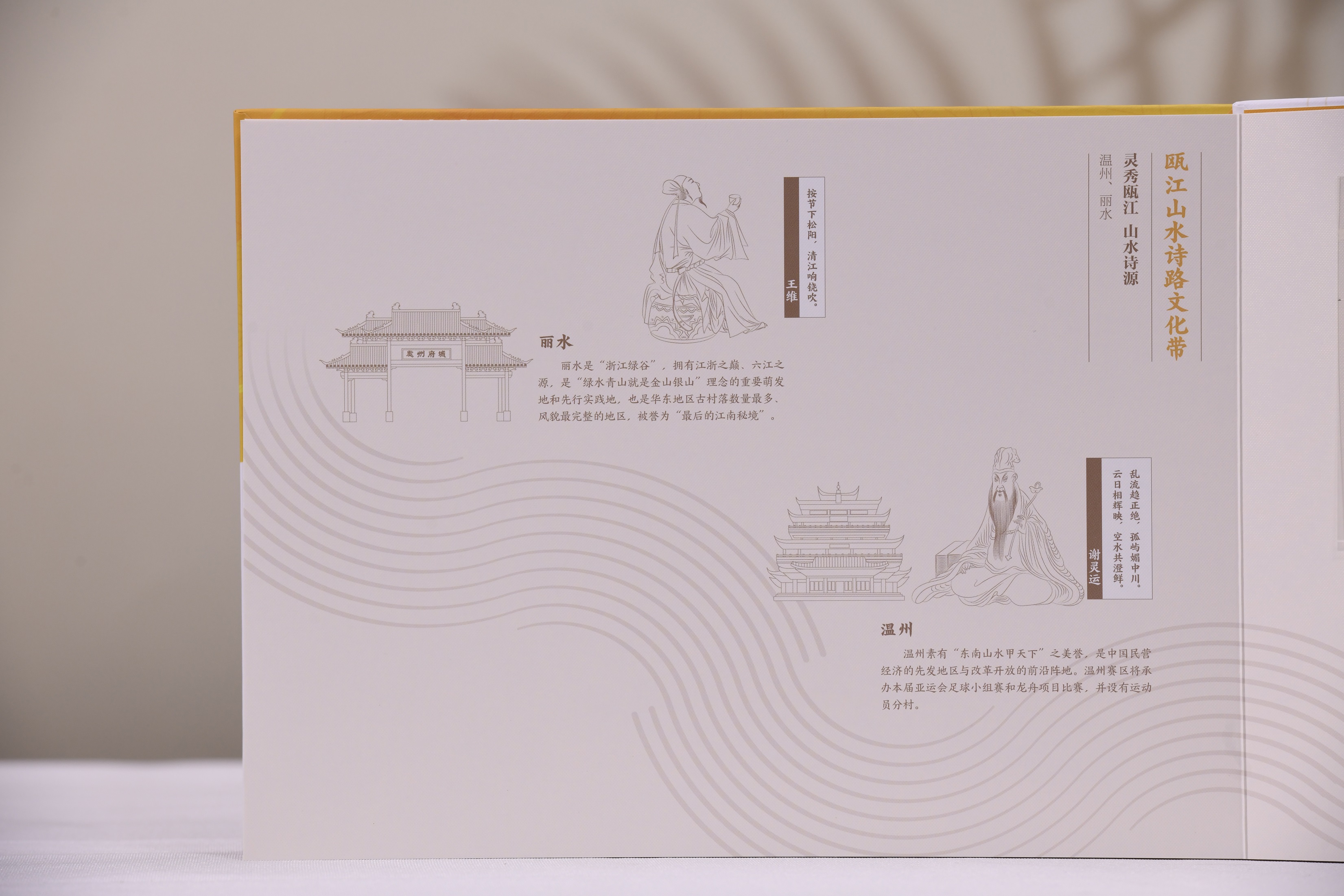 邮折另一侧以“心心相融 诗画之江”和“千年宋韵 时代亚运”为主线,从浙江的四条诗路文化带出发,用古代文人墨客的诗词和地标性的建筑,串联起11座富有文化底蕴又有时代活力的城市,讲述诗情画意的江南故事。