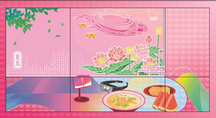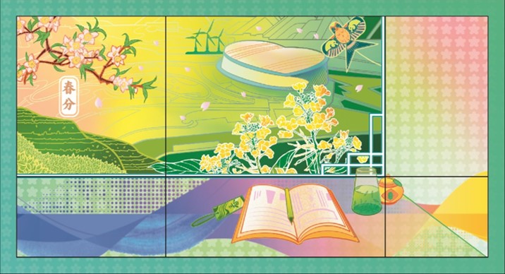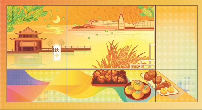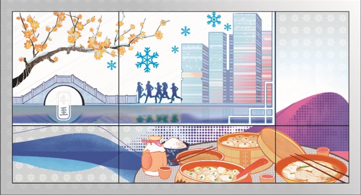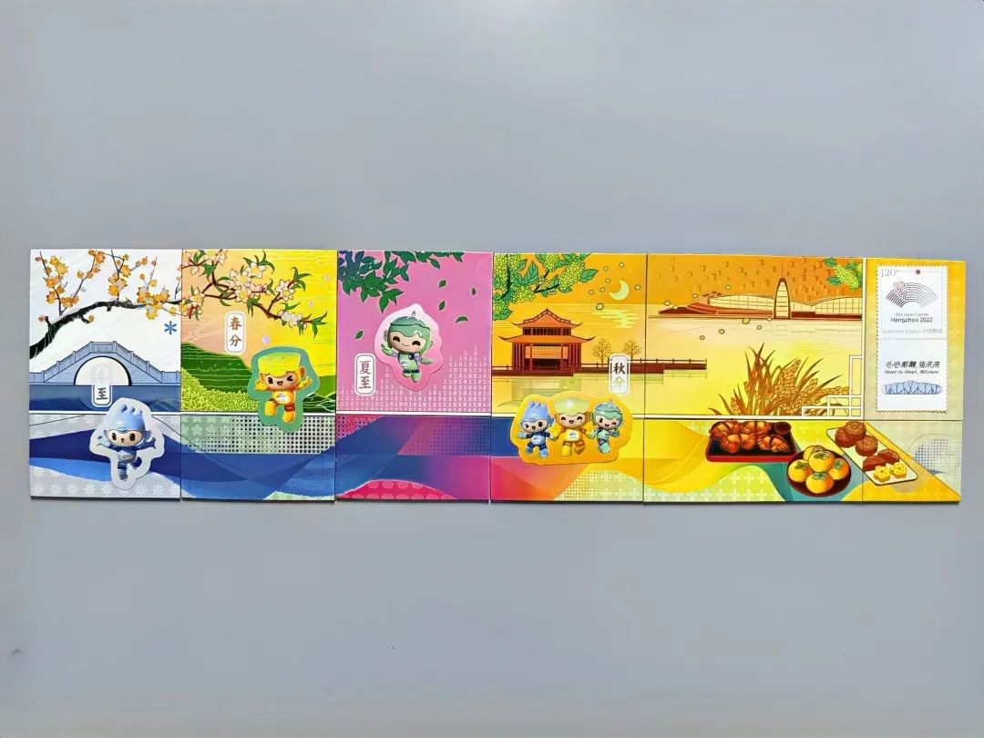 《四时江南看亚运》系列特殊版式个性化邮票以天文类节气为背景,从窗框一角延伸,展现江南节气自然景观、人文风俗和竞赛场馆,会徽“潮涌”如同挂画为小屋增添了亚运氛围。四套邮票沿左侧齿孔线依次叠放,四季色彩的变换和开幕日秋分的场景跃然眼前。