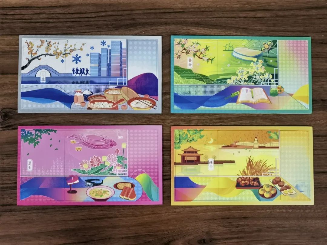 7、《四时江南看亚运》不干胶材质邮票和《四时江南看亚运》邮票软磁拼图图卡(配合使用DIY制作)